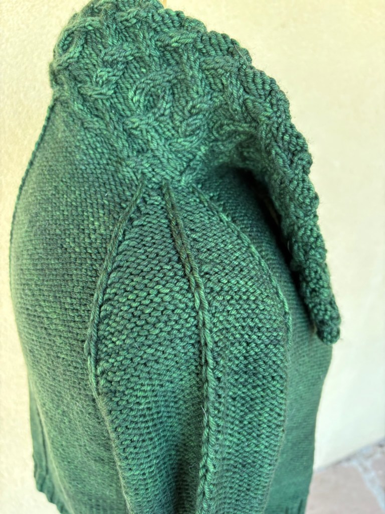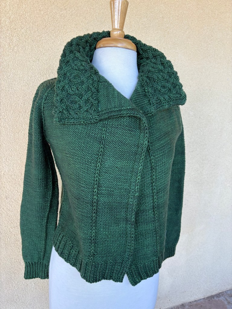 Per Kate’s request, I knit this one in the 3rd size and used the shorter body option and the fold over cabled collar. This gives it a cropped bomber-jacket style feel. The double-thickness collar is super cushy, warm and dense. The pattern does not call for front closures so I left those off, but the fronts overlap by about 4 inches and you could easily add toggle closures or a couple of big buttons or a large pin if you wanted to hold this closed.