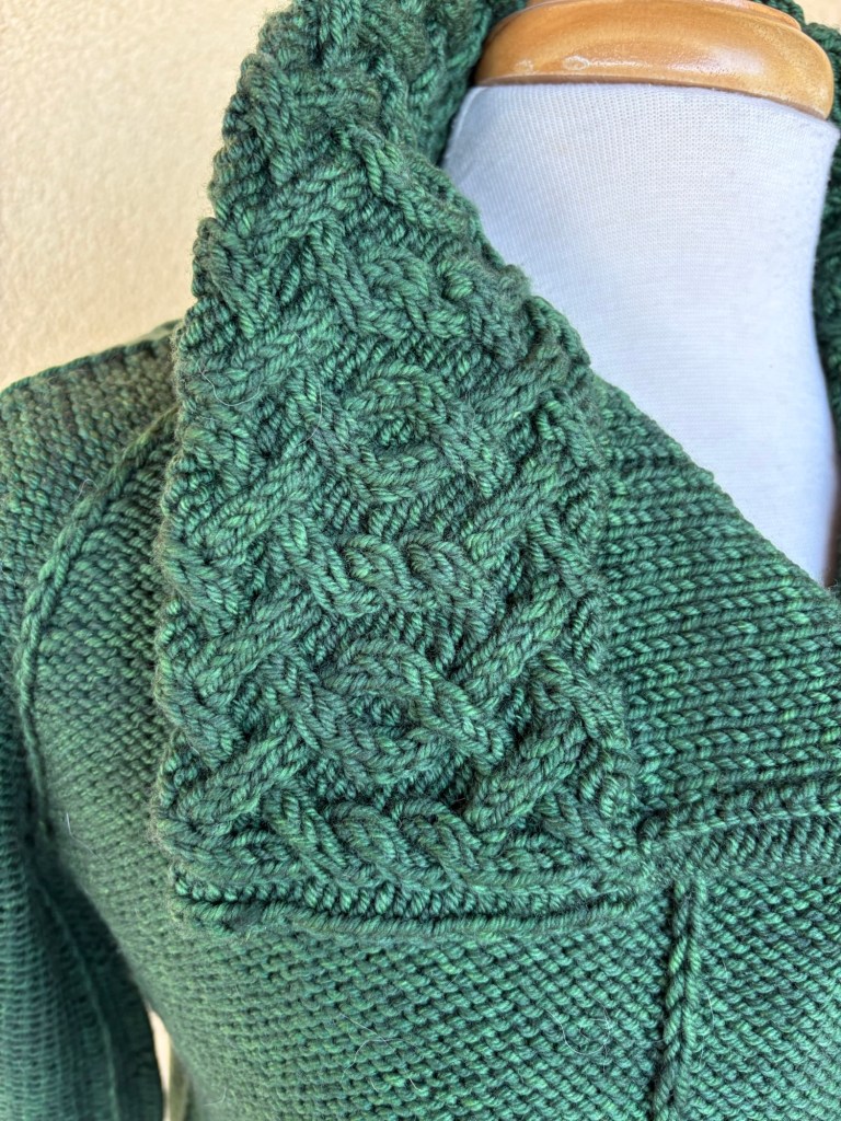 Kate sent me Magpie Fibers’ Quartet Worsted in the color Jolene, which is a dark forest green. It is a superwash merino so it’s nice and soft, and it shows off the stitches in the cabled collar really nicely.