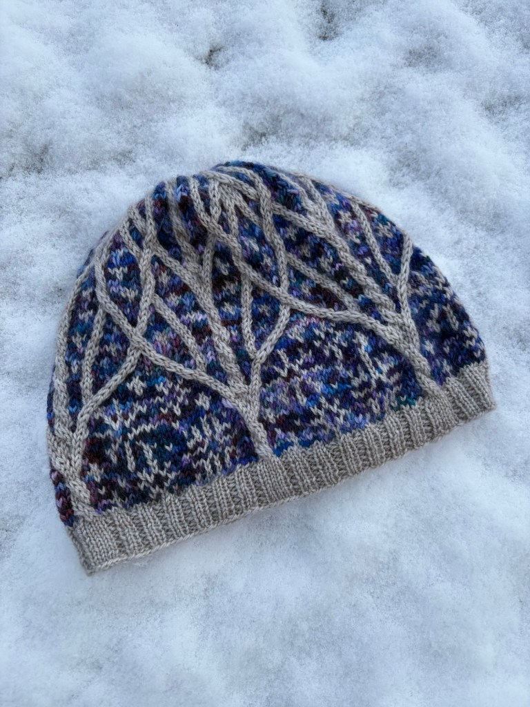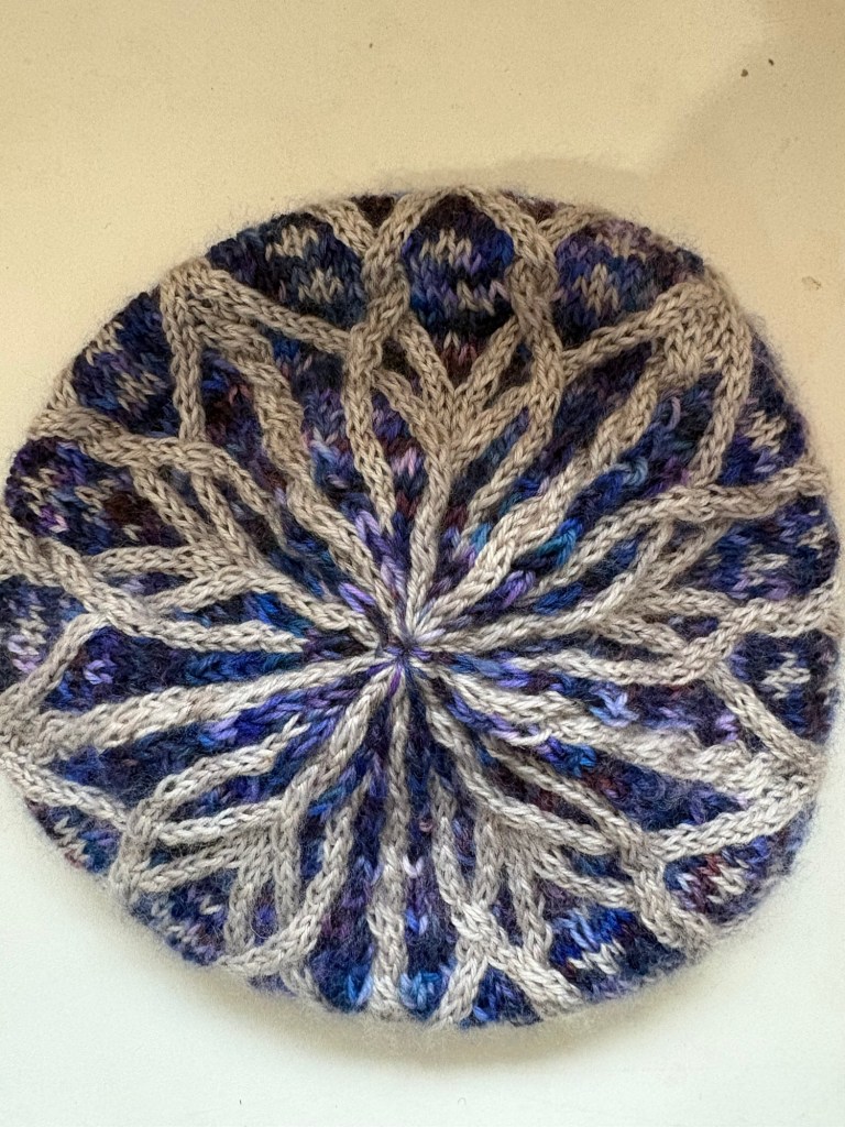 The crown has a lovely star-shaped flower on the top from where the gray cable stitches shift and eventually get decreased away.