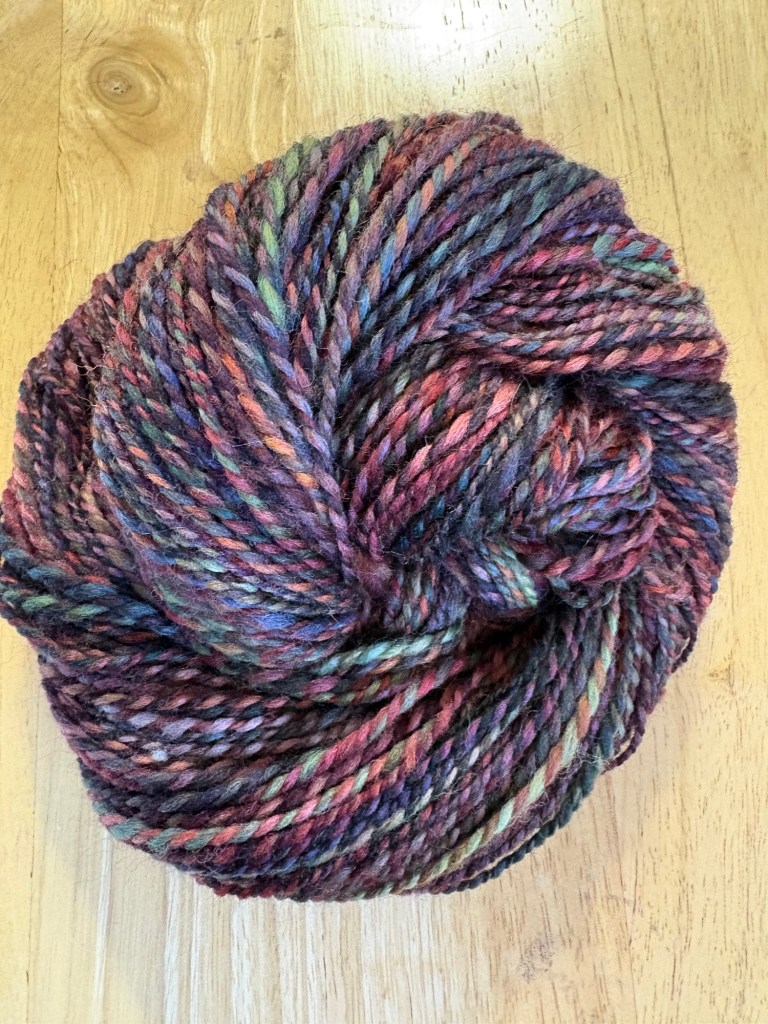 Knockturn Alley Handspun: Also on my personal to-do list is to spin up a braid of stash fiber every other month. This pretty one was Corriedale wool from Two If By Hand and I think I’d describe it as “moody rainbow” (which I love). I spun this up into a 2-ply worsted weight yarn with 187 yards in the skein. Love how this one turned out!