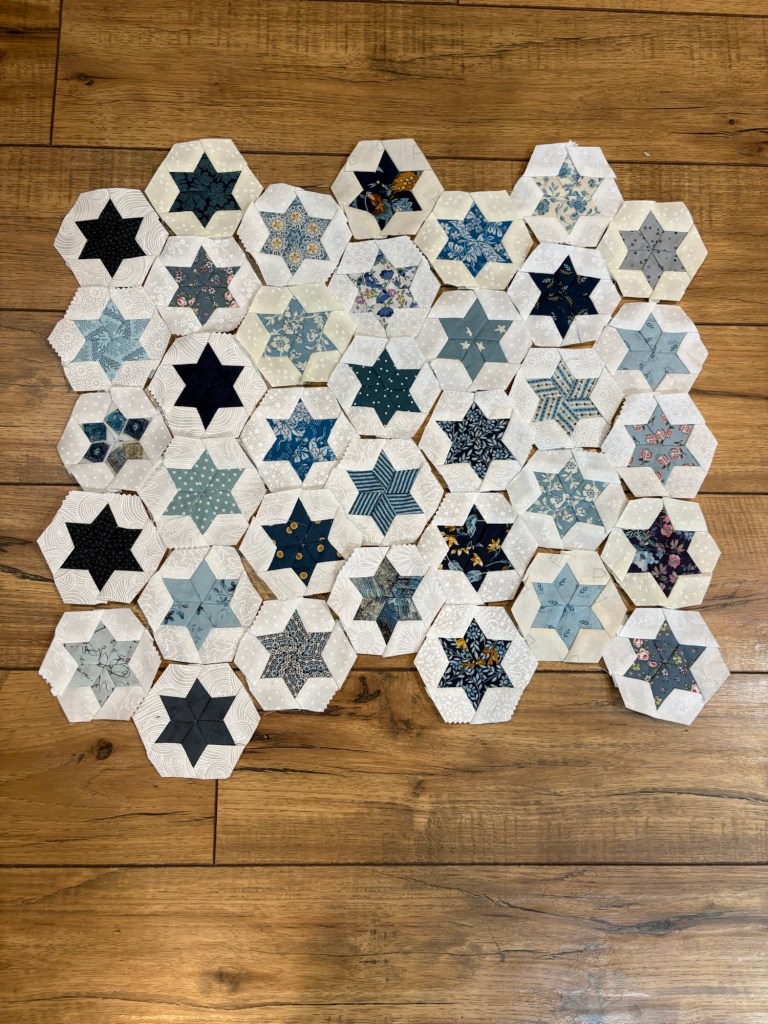 Next, I’m still working along on my 100-day project of hand-pieced star hexagons in shades of blue. Today marked day 36 of the 100 days. My mum really liked the ones she saw that I was working on at her house, so when I have the hexi’s assembled into a table runner, that’ll be going to her.