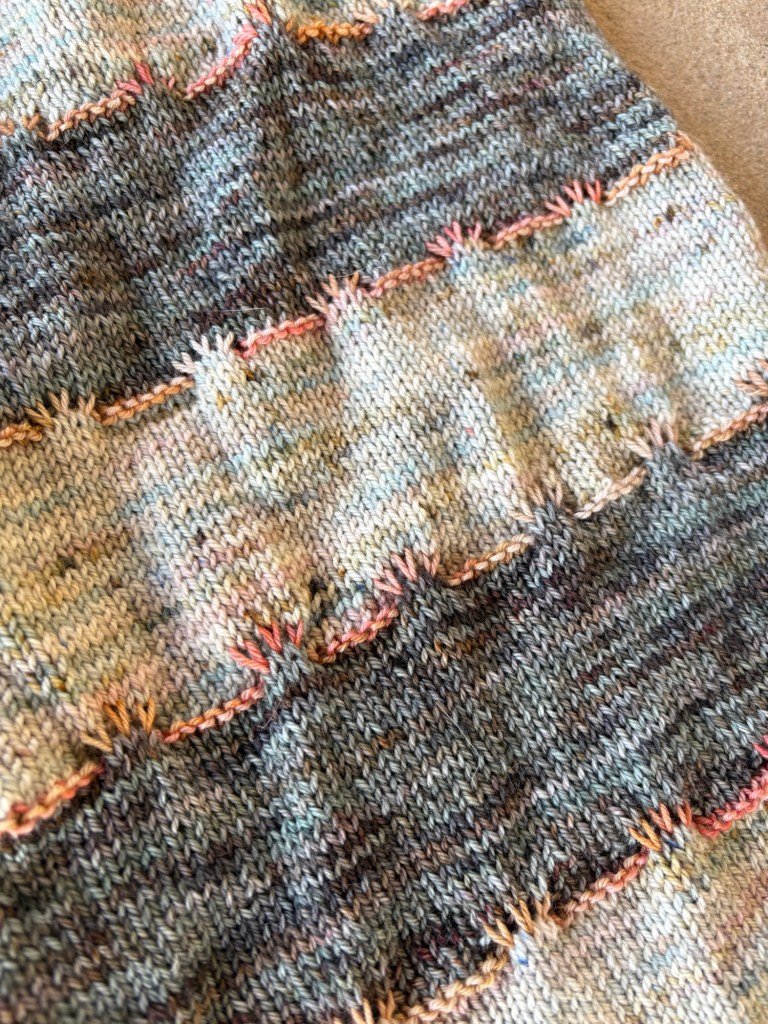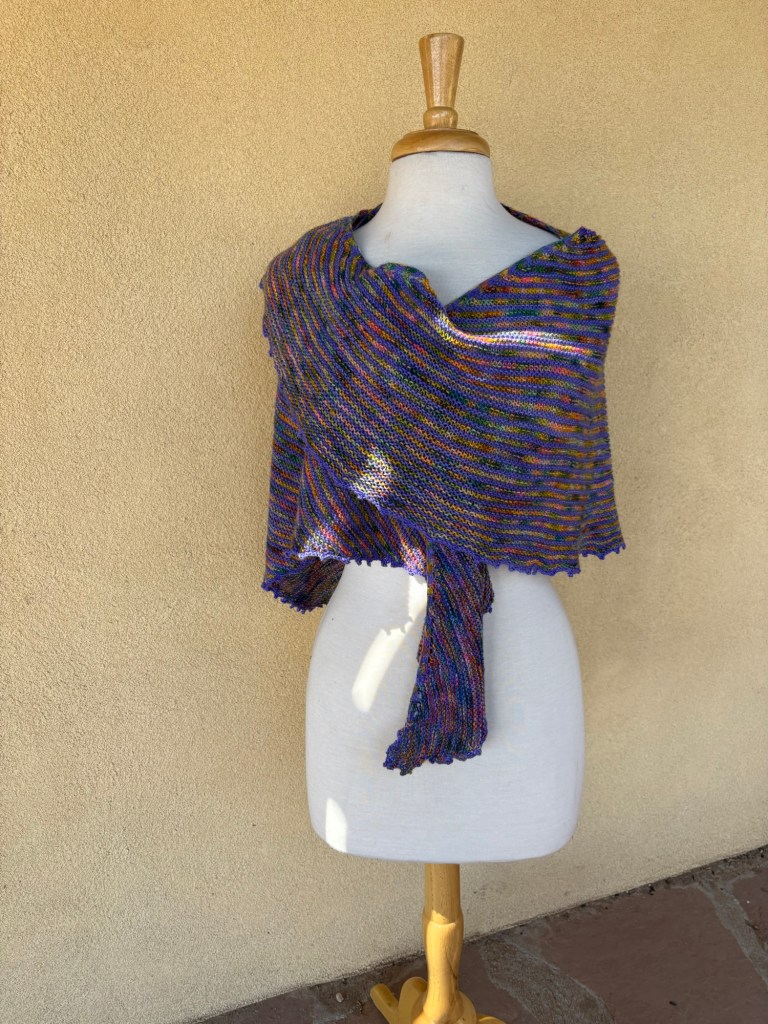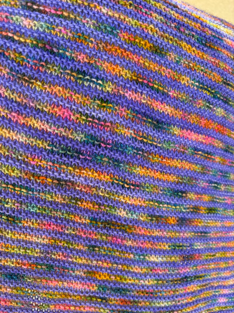 First up, I finished my Faded Stripes shawl. This is a free pattern from Hedgehog Fibres and is a really great way to use up 2 skeins of sock yarn. It is mostly mindless garter stitch stripes with a bit of shaping to give a slightly asymmetrical deep crescent. I used a skein of Countess Ablaze BFL Sock and a skein of Green Letter Day Sock, both from my Bin 10 project stash. This one will be added to the box for hospice shawls I’m planning to send out this week.