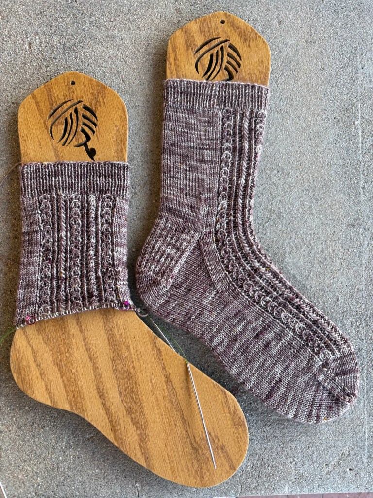 I took along the half-finished Tea Leaves socks, the first of which I finished earlier this year, and managed to get almost the entire leg knit for sock 2. I’m knitting this pattern up using Long Dog Yarn’s Sock Yarn in the color Riders of Rohan. Hoping to get the final pattern repeat knit this week and then turn the heel.