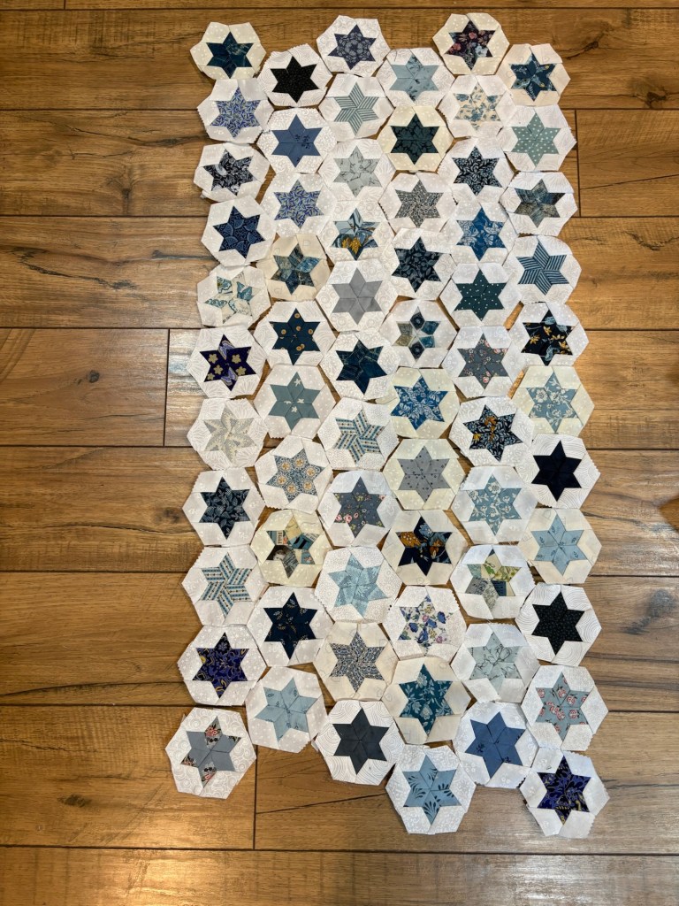 I am still plodding along on my 100-day project. Here’s day 65 of hexi stars completed.