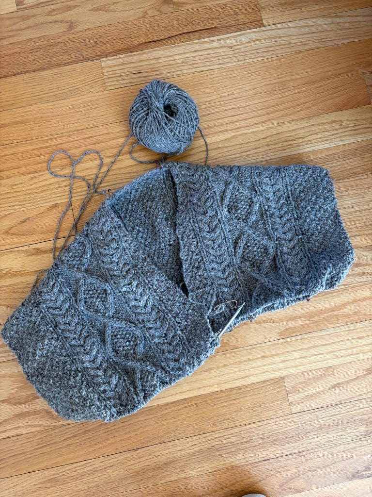 I pulled out my Book Club Cardigan, designed by Sari Norrland, to start working on again. I have the fronts and back joined, so I’m working back and forth on the body right now.