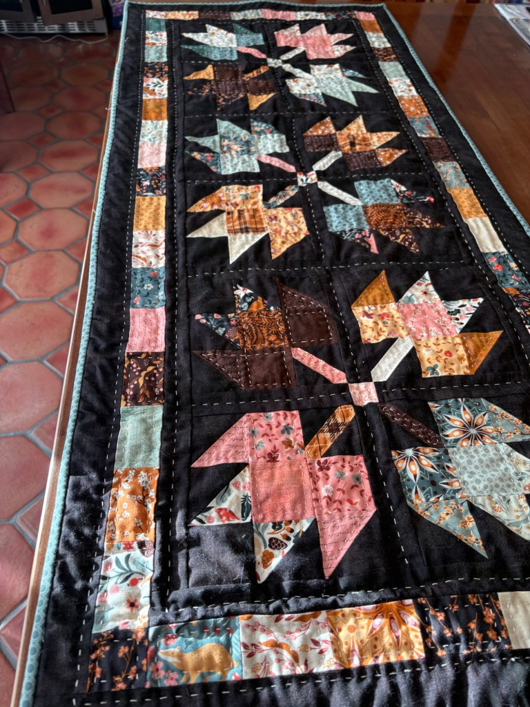 First, I managed to finish quilting my Leaf Pile table runner AND got the binding put on. I absolutely love how this turned out with the fun prints against the dark background.