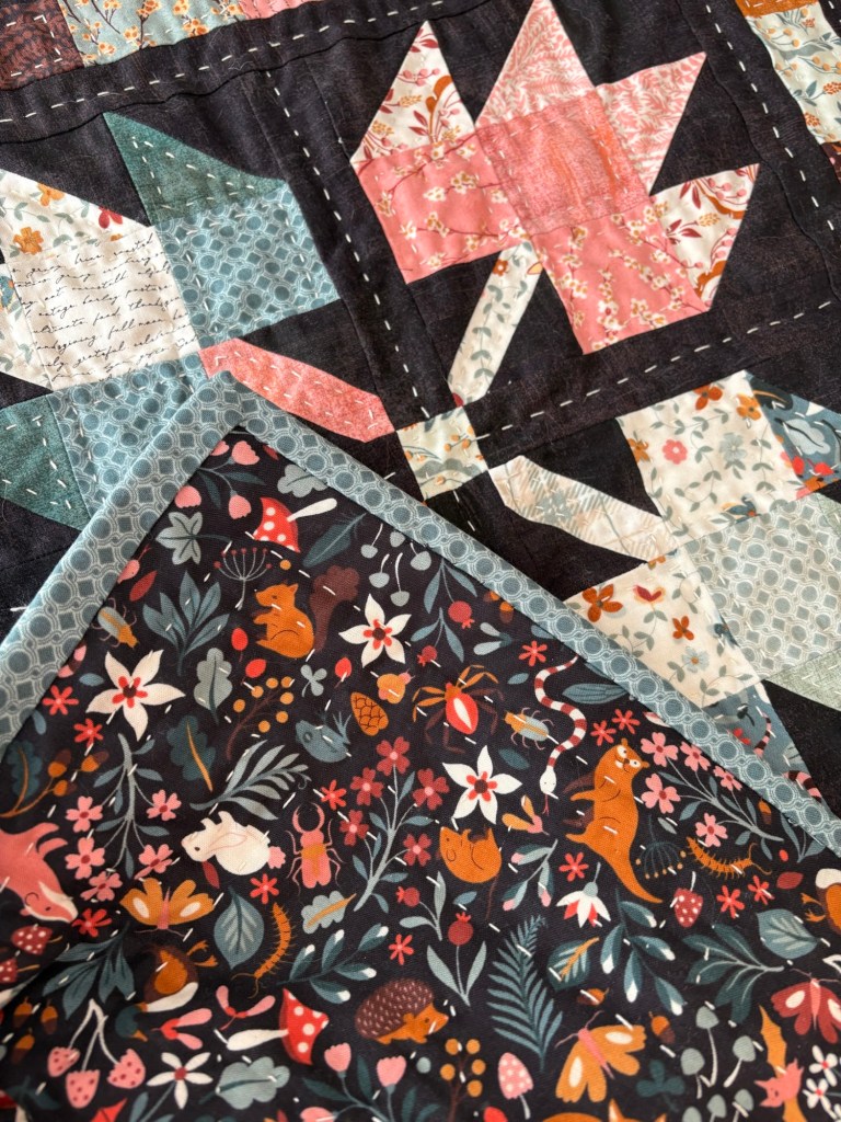 I did a trial of “big stitch quilting” on this and I don’t think I would do that again. It looks fine but it was really hard on my hands and I think I prefer smaller, more subtle stitches. Regardless of that, I still love how it turned out and I’m ready for fall now! Here’s the fun backing with all sorts of adorable forest friends.